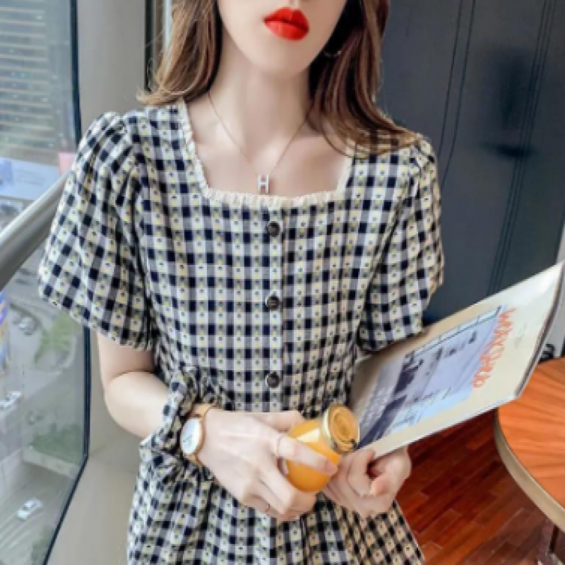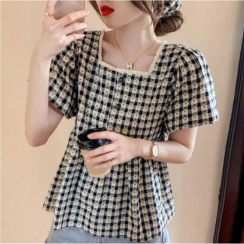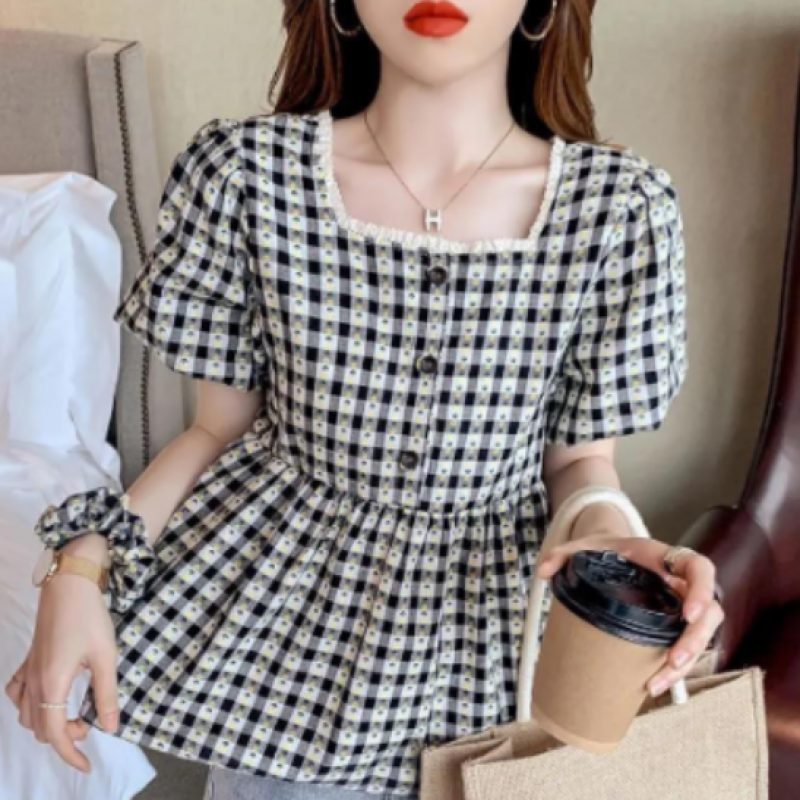 Puff Sleeve Ruffle Skirt Blouse Women Summer Chic Designer Plaid Puffy A Line Square Collar Kids Shirt (2pcs) $6237.0 |